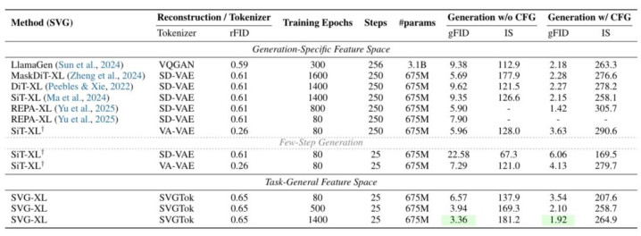 训练效率方面,在ImageNet 256×256数据集上,SVG-XL模型仅训练80个epoch,在无分类器引导时FID达6.57,远超同规模基于VAE的SiT-XL(22.58);如果延长训练至1400个epoch,FID可低至1.92,接近当前顶级生成模型水平。