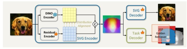 和谢赛宁团队极简复用预训练编码器、改造DiT架构,专注于生成性能的RAE不同,SVG通过语义+细节双分支+分布对齐,实现了多任务通用。