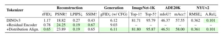 不仅是生图,SVG的特征空间继承了DINOv3的能力,可直接用于图像分类、语义分割、深度估计等任务,且无需微调编码器。例如,在ImageNet-1K分类任务中Top-1精度达到81.8%,与原始DINOv3几乎一致;在ADE20K语义分割任务中mIoU达46.51%,接近专门的分割模型。